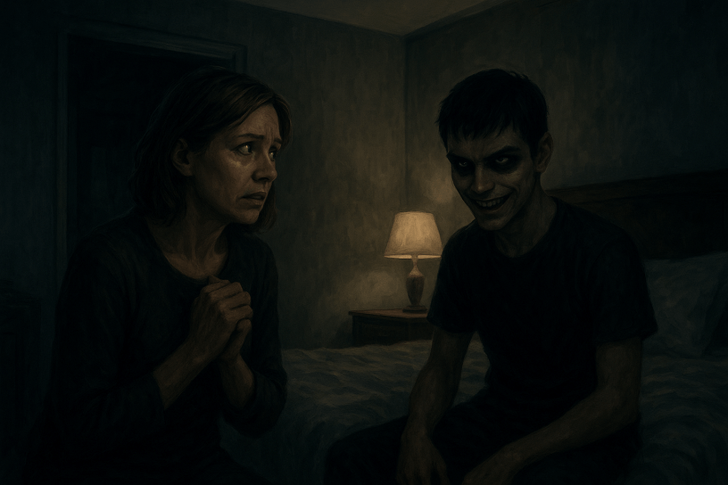 Naquela noite, ele a observava do canto do quarto, olhos abertos demais, sorriso calmo demais. A voz, baixa como uma prece:
